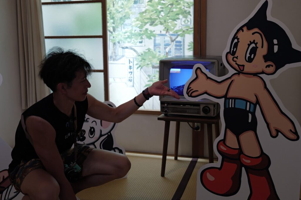 中に入って一番に感じたのは、「当時の家、低っ!」ということ(笑)。 僕は身長が180cmあるのですが、写真を見てもらうと分かる通り、鴨居に頭がつきそう…というか、ほぼついてます。手塚治虫先生や藤子不二雄先生たちがこの空間で、机に向かっていたのかと思うと、なんだか不思議な親近感というか、当時の生活のリアルが伝わってきました。