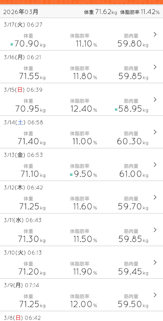 毎朝ランニングとダッシュと筋トレを30分やっている。食事はPFCバランスを考えて、タンパク質を意識的に摂っている。一人のときは揚げ物もお菓子も食べない。体脂肪率は8〜13%をキープしていて、体内年齢は24歳と出る。40歳の身体としては、おそらく上位数パーセントに入る管理をしていると思う。